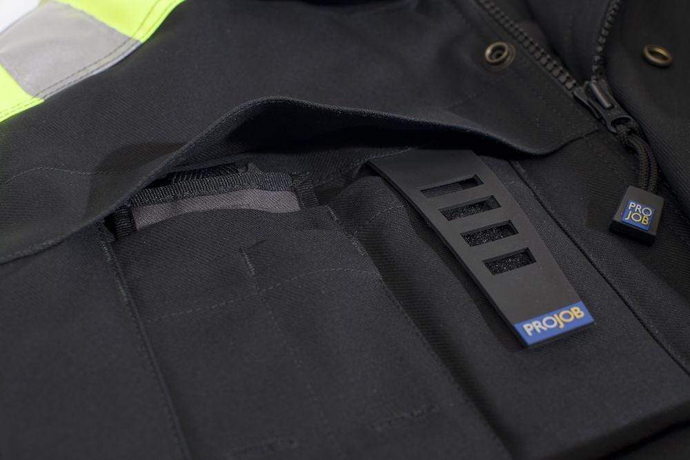- Schlaufe für ID-Kartenhalter. Fluoreszierendes Obermaterial auf der Schulter mit Reflektoren.